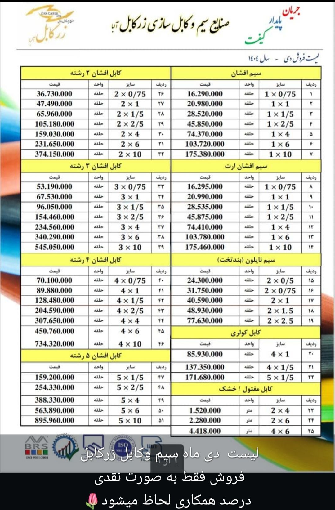 لیست قیمت سیم و کابل زر کابل (آلبا) دیماه 1404