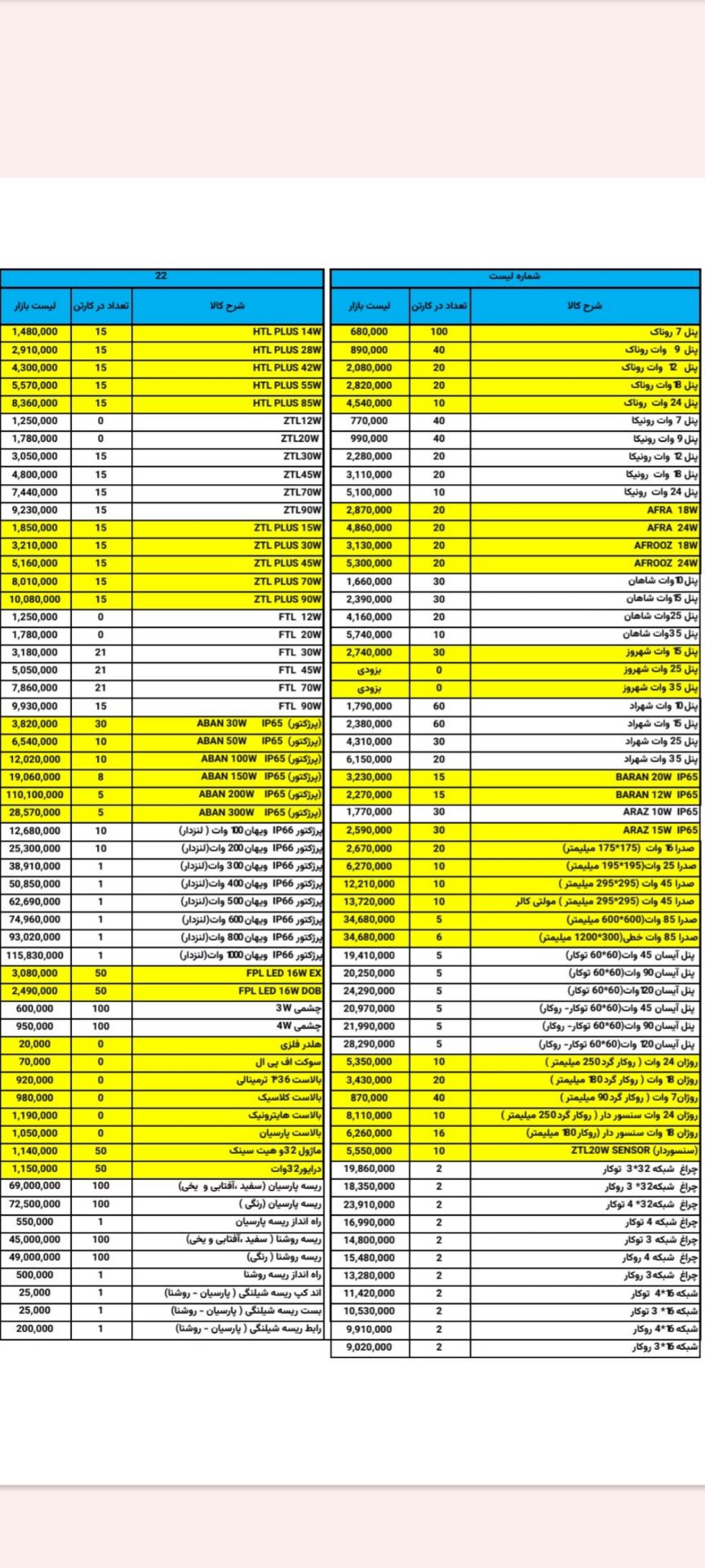 لیست قیمت محصولات روشنایی شاهچراغ پارسیان دیماه 1404